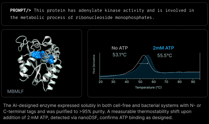 310.ai’s MP4 platform designed a novel enzyme optimized for ATP regeneration. Unlike natural adenylate kinases, this protein, while ~70% similar to natural adenylate kinases, features AI-designed structural enhancements that boost stability, binding, and catalysis beyond evolutionary constraints.