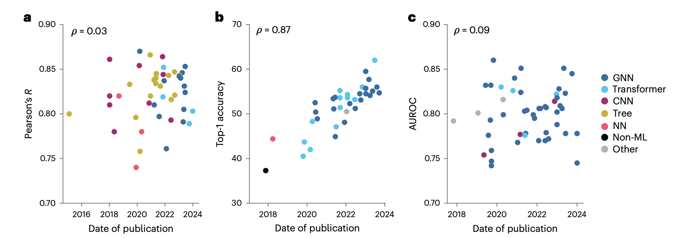 The three benchmarks are CASF-2016, measured by Pearson’s R, the linear correlation between predicting and true binding affinity (a); USPTO-50k, measured by top-1 accuracy, indicating the percentage of times the highest-confidence reaction was correct (b); and HIV MoleculeNet, measured by area under the receiver operating characteristic (AUROC), a performance measurement for classification for binding or not binding at various thresholds (c). Papers are colored by ML architecture employed for the method and the Pearson’s R (ρ) between date of publication and benchmark metric is given in the top-left for each graph. CNN, convolutional neural network; NN, neural network